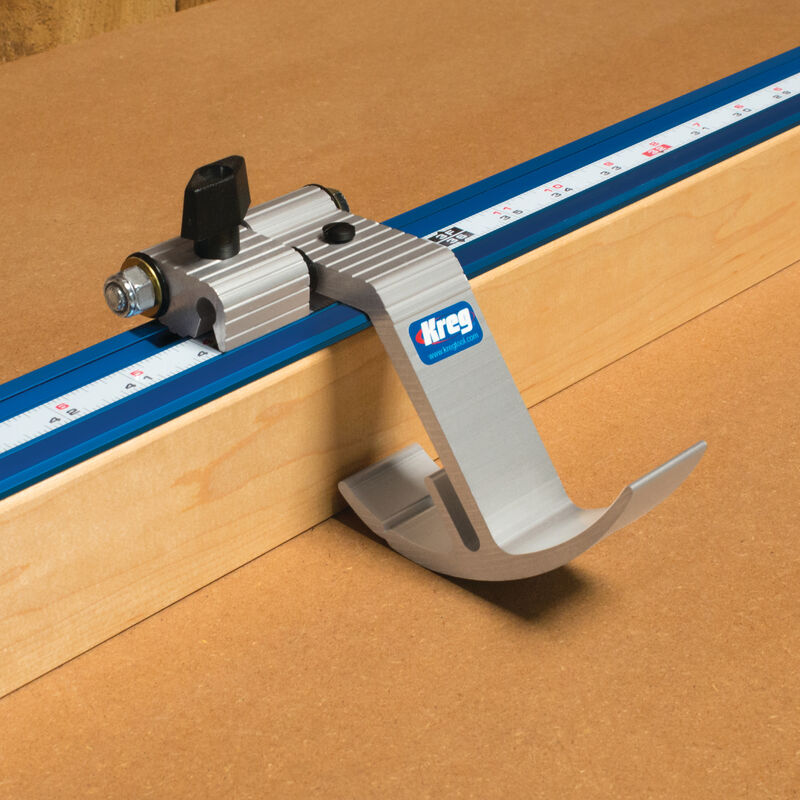 Construisez une simple boîte en contreplaqué ou en MDF pour correspondre à la hauteur de votre scie, puis ajoutez un guide arrière qui atteint 21/4" (57 mm) au-dessus de la table de la scie pour que les butées glissent dessus. Instructions et matériel de montage pour le rail sont inclus.