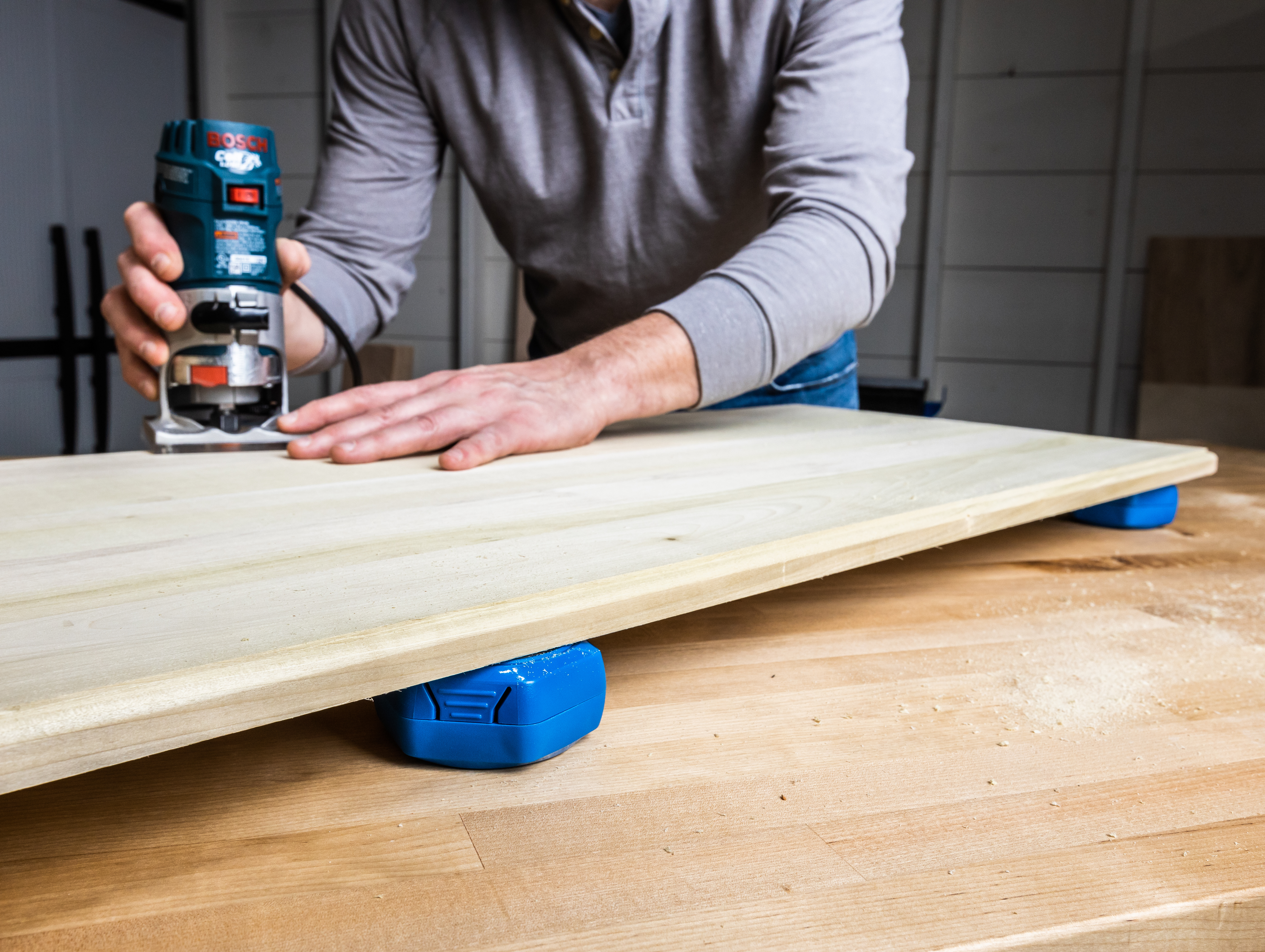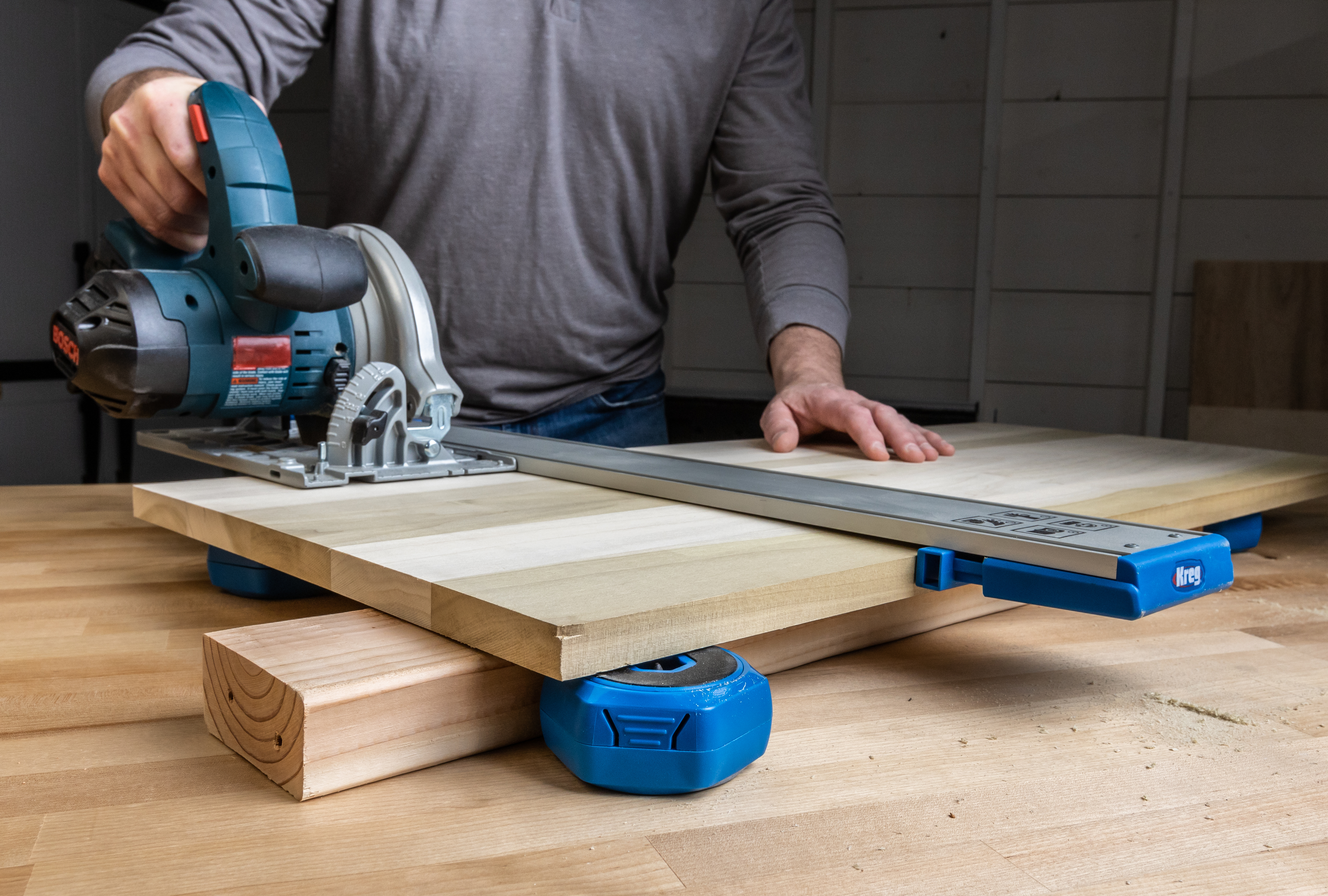 Les marques d'alignement et les surfaces GripMaxx maintiennent le guide en position et il s'adapte fermement sur le bord des matériaux de 1/2'' et 3/4'' .