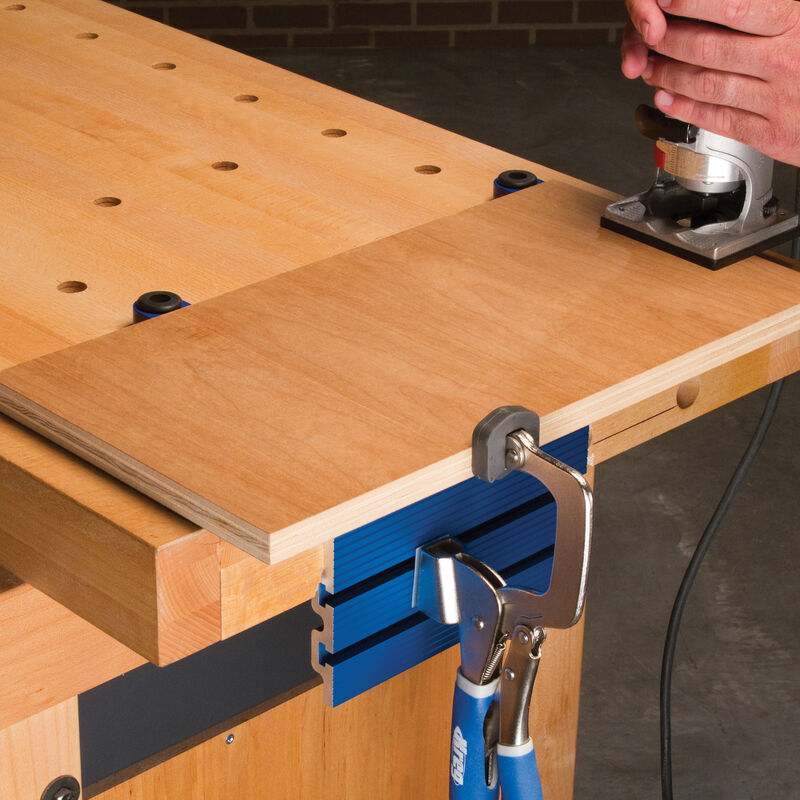 Chaque ensemble vient avec des versions plus longues du même rail en aluminium anodisé utilisé dans la table de serrage, ainsi que du matériel et des instructions qui vous montrent comment les incorporer dans votre établi. Avec ces rails et quelques pinces d'établi Kreg (vendues séparément), vous pourrez avoir un établi et une station de serrage polyvalente dans une seule unité pouvant contenir des pièces de toutes tailles.