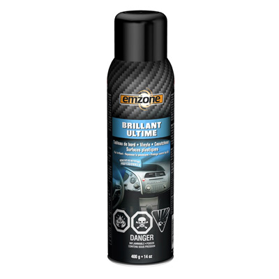 Détail du produit: Le BRILLANT ULTIME d’emzone embellie, renouvelle et protège les surfaces, fournissant un brillant riche sur le vinyle, le cuir, le caoutchouc et le plastique. À utiliser pour lustrer et protéger les tableaux de bord, les sorties de ventilation, les portes et sièges de camion. Notre formule anti-UV et antistatique repousse la poussière et protège contre les rayons UV. Idéal pour les voitures, bateaux et camions.