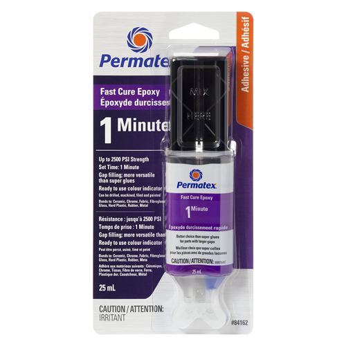 Détail du produit: seringue de distribution à 2 sections facile à utiliser comble les fissures et colle des matières différentes peut être percé, usiné, limé et peinturé meilleur choix que les super colles pour les pièces avec un plus grand écart résiste à la plupart des liquides dont l?essence et les solvants apparence transparente prise en 1 minute résistance permanente jusqu?à 2500 psi température de service : -51°C à 150°C (-60°F à 180°F)