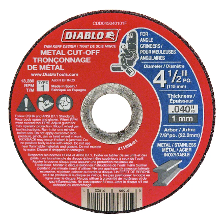 Détail du produit: Disque de meuleuse à tronçonner de type 1 de 4 1/2 po x 0,040po x 7/8 po pour la coupe du métal